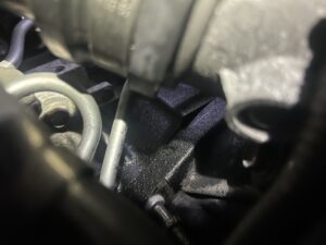 キャビンを上げてエンジンの状態を確認し、ディーゼル車用のDH-2オイルへ交換作業を進めていたところ、エンジン周りからの**「オイル漏れ」**を発見しました。