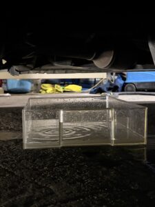 車体の下から出てくるこの**「ドス黒い汚水」**を見ると、皆様「こんな空気を吸っていたなんて…」と絶句されます。このすすぎの水が完全に「透明」になるまで、何度も何度も徹底的に洗い流します。