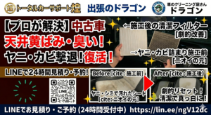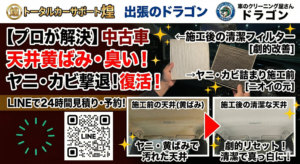 「中古車のニオイが気になる」「シートのシミを消したい」 そんなお悩みは、出張クリーニングのドラゴンにお任せください!