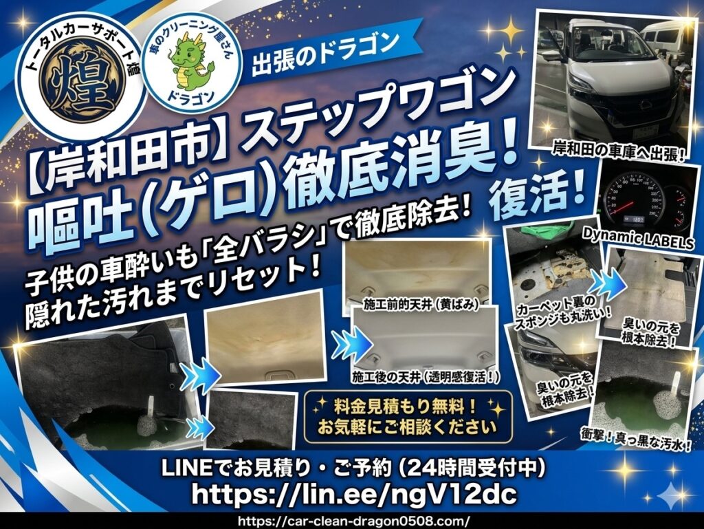 【岸和田市】ステップワゴンの嘔吐(ゲロ)特殊クリーニング!子供の車酔いも「全バラシ」で徹底消臭