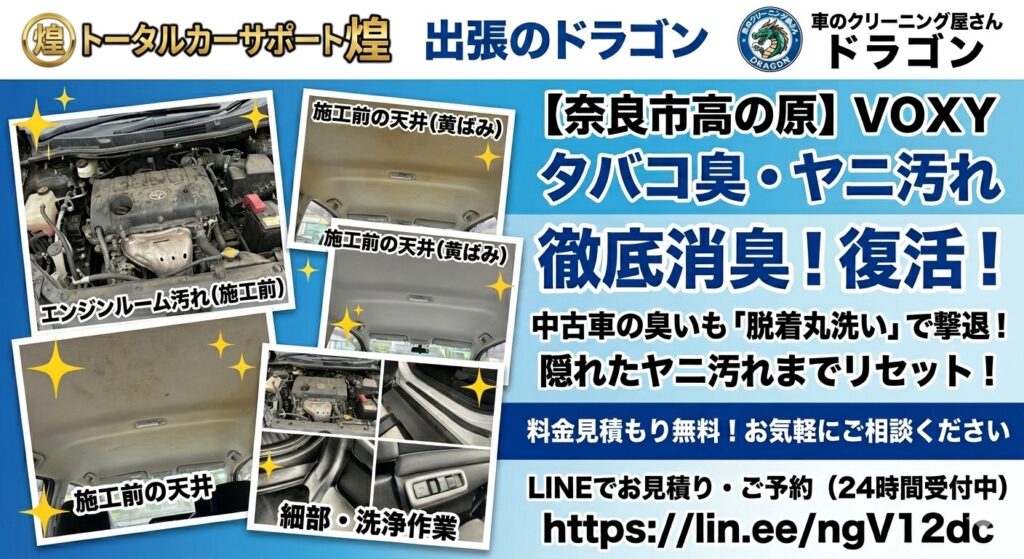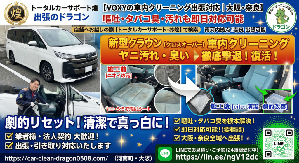 【VOXYの車内クリーニング出張対応|大阪・奈良】嘔吐・タバコ臭・汚れも即日対応可