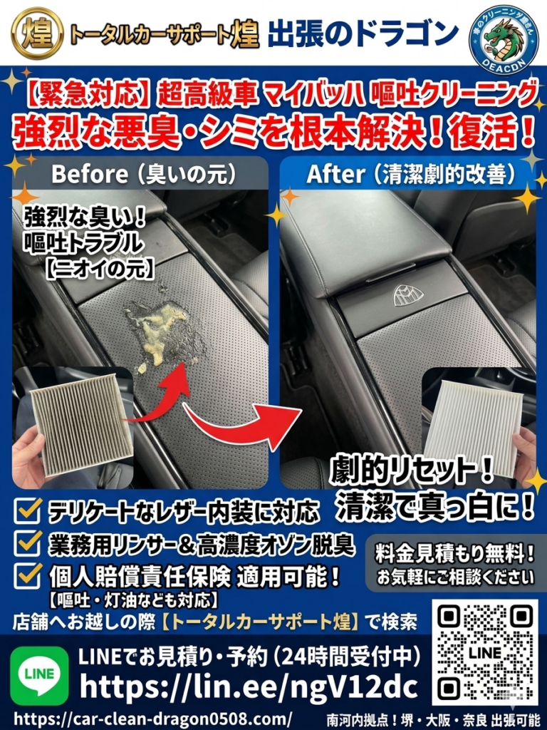 【堺市西区へ出張】マイバッハの車内嘔吐クリーニング|南河内郡発・高級レザーも完全無臭リセット