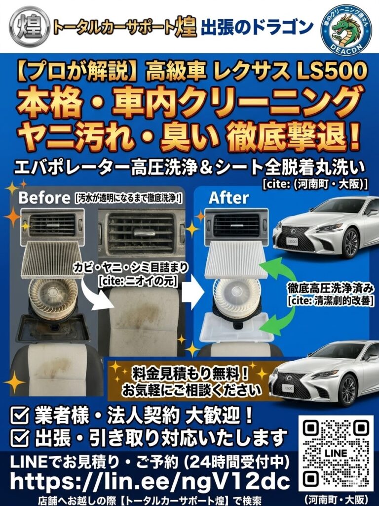 大阪・南河内郡を拠点とする**トータルカーサポート煌(きら)**では、プロ仕様の洗浄機材と薬剤を使用し、シートやカーペットの奥に潜む汚れや菌まで徹底的に除去します。